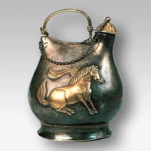 西安何家村唐代窖藏的大批金银器中,有一件皮囊式的马镫壶。这件壶,除形制特殊、花纹精美外,还反映了李唐统治从兴盛走向衰落的历程,因而引起了人们的浓厚兴致。皮囊式银壶高18.5厘米,口径2.3厘米。造型采用了我国北方游牧携带的皮囊和马镫之综合形状。扁圆形的壶身顶端一角,开有竖筒状的小壶口,上置覆莲瓣式的壶盖。盖顶和弓状的壶柄以麦穗银链相连,壶身下焊有椭圆形圈足。这种仿制皮囊壶的形式,既便于军旅外出时携带,又 ...
