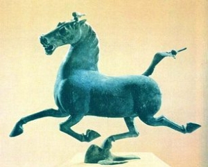 1969年,武威新鲜公社社员在雷台南部开挖战备地道,一件出人意料的事件发生了。几镐头下去,只听轰隆一声,砖墙上出现了一个黑洞。当人们爬到里面才发现,那是一间用青砖砌成的墓室。里面遍地是排列整齐的铜人、铜车、铜马等,旁边还有座棺床,里面呈放着两具尸骨架,在尸骨脚下堆放着几件陶罐。原来,这是一座汉墓。著名的铜奔马就出土于此。 铜奔马又名“马超龙雀”、“ 马踏飞燕”,为东汉青铜器,东汉时期镇守张掖的军事 ...