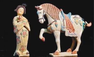装束是时代风气最明显的标识之一,女性装束更是社会风景中的亮点。唐彩绘女俑和战马 一个社会的文明程度、文化交流程度,乃至思想意识等等,都可以在女性装束中反映出来。时至隋唐,唐代服饰进行了很大的变革。其中唐代女装在历史上尤为著名。唐代国家统一,经济繁荣,社会更加开放,服饰愈益华丽。在妇女中间,出现了袒胸露臂的形象。在永泰公主墓东壁壁画上,有一个梳高髻、露胸、肩披红帛,上着黄色窄袖短衫、下著绿色曳 ...