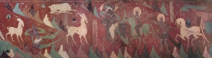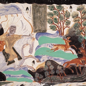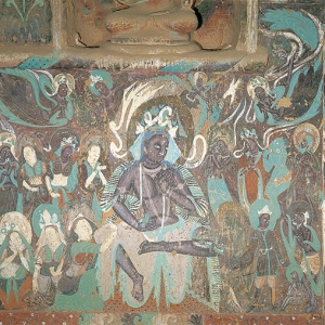 莫高窟第299窟-窟顶东披-睒子本生故事之国王误射睒子(北周)佛教本是教人远离世俗生活、离家出世修行的宗教,但中国人注重孝道的传统,使佛教传入中国后也开始注重孝养观念。为了赢得更多的中国信众,佛教宣传佛也是注重孝养父母双亲的,其中最有代表性的就是睒子本生故事。故事说,在很久以前有一位名叫一切妙的菩萨,他看到迦夷国有一对善良的盲夫妇没有子女,便转生投胎成了他们的儿子,名叫睒子。睒子七岁时,心地善良,孝顺 ...