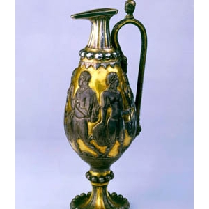 图1:李贤夫妇合葬墓出土鎏金银瓶 鎏金银瓶,北周,1983年出土于宁夏固原市原州区南郊乡深沟村李贤夫妇合葬墓中。现藏宁夏固原博物馆,是通过丝绸之路流传到中国的具有萨珊风格的金银器,精美绝伦,独一无二,号称固原博物馆的“镇馆之宝”。1996年,国家文物鉴定委员会确定其为“国宝”。 银瓶通高37.5厘米,最大腹径12.8厘米,重1.5公斤。银质,表面鎏金,环形单把,把上方铸一头戴贴发软冠,高鼻深目的人头,面向瓶口,瓶 ...