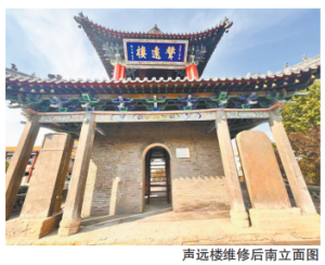 声远楼是山东济宁崇觉寺附属钟楼,其历史可追溯至北宋时期,明天顺五年由济宁州同知郝敬主持重修,清乾隆五十三年再度重建,道光年间亦曾修缮。近代以来,济宁市博物馆分别于1983年、1997年和2006年对其台体、屋面、彩画等部位实施不同程度修缮。声远楼为两层亭阁式建筑,平面呈方形,南檐悬有明万历年间济宁道台龚勉所题“声远楼”匾额。楼内设木梯可登临 ...