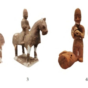 西安等驾中村十六国墓M3出土鼓吹俑可分为骑马鼓吹俑、骑马执旗俑和步行鼓吹俑3类。步行鼓吹俑所奏㧏鼓类乐器以及骑马与步行相结合的鼓吹组合方式反映出十六国时期的关中地区与中国东北、西北地区存在密切的文化交流,且从该墓及关中地区其他十六国时期墓葬出土伎乐俑与鼓吹俑的数量来看,十六国中晚期主流音乐表演形式已出现“胡兴汉衰”的发展演变趋势。 ...