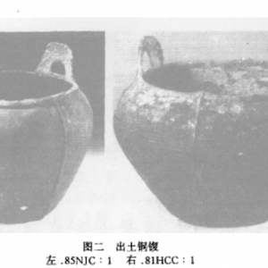 宁夏固原县出土的铜锲 铜锲是北方系青铜器的代表器物之一 因其适应于北方游牧民族的马上生活,多出土于内蒙古等地。近年来,在宁夏固原县境内曾屡有出土,现将几件比较有特点的介绍如下。 82HCC:1 1982年宁夏固原县河川乡出土。侈口,束颈,弧肩,颈部两端附有两个略有不同的环耳,圆腹,圜底。腹上部饰凸弦纹二周,沿面微凹,腹部有两处、底部 ...
