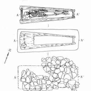 化德县陈武沟鲜卑墓地发掘简报(下)内蒙古自治区文物考古研究所 乌兰察布市博物馆化德县文物管理所 【接 化德县陈武沟鲜卑墓地发掘简报(上)】 M11 位于墓葬区中南部,墓口上部有长方形石堆墓标。长 220、宽120、高45厘米。该墓为长方形竖穴土坑墓,长230、宽80、深240厘米。方向250度。葬具有木棺,保存较好。木棺前端宽且高,后