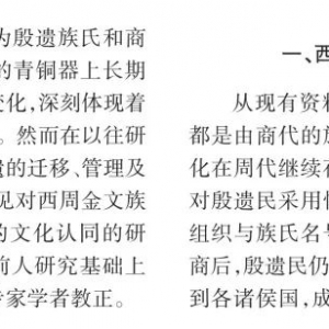 【关键词】金文族徽;西周;商周族群;文化认同【摘要】通常认为,西周金文族徽是商代晚期族氏名号的沿袭,事实上,西周金文族徽还存在许多变化:一是族徽地域分布中心转移,二是族徽铜器数量由增转减,三是族徽种类减少,四是人名、地名、官名性族徽增加,五是族徽功能与性质有所变化。正确认识西周金文族徽的这些变化,对于深入认识当时周人铜器上出现殷 ...