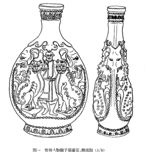 太原西郊出土唐青釉人物狮子扁壶 《考古》1963年05期 1956年春,太原市西郊修筑玉门沟车站时出土一件青釉人物狮子扁壶,现存山西省博物馆。 壶作圆口扁腹,高28、最宽16.5厘米,出土时口部打掉一块,现已修复。灰白细缸胎,淡青黄色釉,与太原唐墓中出的青瓷相类似。壶的正背两面纹饰相同,显系模制。 口缘与底座周边,饰以连珠纹与叠带纹 ...