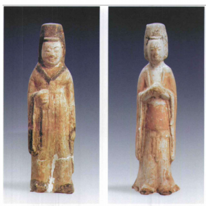 陕西潼关税村隋代壁画墓发掘简报(上)原载《文物》 2008年第5期。3.立俑笼冠俑 11件。分2型。I型 7件。标本1,头戴黑色笼冠,蓄“八”字须。上身着红、白缣色交领右衽广袖袍,下穿曳地长裳。白色宽腰带上提,束于胸前。右臂曲肘,右手握拳置于胸前;左臂^下垂,手隐袖中。脚穿圆头鞋。高22.1厘米(图一三、五五: 1)。II型 4件。标本42,头戴黑色笼冠,上 ...