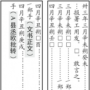 摘要:里耶秦简9-18719-24699-24719-18839-1893是一份官文书,其传递过程是“A县库→A县廷→迁陵县廷→迁陵库”,可分为“库□告县廷书”“丞欧告迁陵主书”和“迁陵守丞殷告库书”三个传递阶段。其中,“丞欧告迁陵主书”和“迁陵守丞殷告库书”在县廷的处理流程可归纳为“原件签署+抄件批转+原件存档/抄件送出”,即:①在原件上签署收文记录;②抄