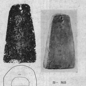 陕西蓝田发现罕见的文物 《考古》1964年06期 1963年11月,因赴蓝田参观猿人化石出土地点,有机会到蓝田县文化馆。在该馆见一陶器,上端凿一孔。高19、底宽11、顶宽6.4、底厚8、顶厚4厘米。一面磨平,一面带有孤度,两侧平直,实心,重约1650克。平整的一面刻划有“将行内者”四字,字体为篆书(图一)。据文化馆雷同志谈,此物系1959年修建蓝田 ...