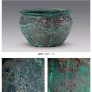 盆 二件。形制、纹饰和铭文内容相同。倗伯盆(M1017∶9),敛口,卷折沿上翘,小方唇,厚薄不一,折肩,弧腹内收,最大径在肩腹转折处,平底略凹,边缘有磨损(图版贰拾壹,1)。肩饰鸟纹一周,两侧以范线为界分二组,每组四鸟,分二单元,每单元二鸟,界以兽头,两两相对,鸟昂首,凸圆目,冠后下折而上扬,末端分叉,短身,二足,鸟尾分二股,上股较细 ...