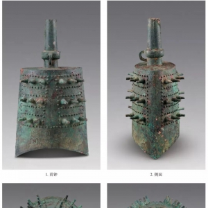 (二)青铜乐器甬钟 三件。M1017∶15,甬较高,中空,横截面呈扁圆形,有旋有干,干近方形,横截面为长方形,舞呈橄榄形,钟体两面以乳钉纹界隔钲部和篆带,每面十八枚,钲部两侧三横三竖排列,枚中部有缩棱,顶部大多平整,个别枚顶部圆凸(图版叁拾伍,1)。钟腔内无调音槽(图版叁拾伍,4)。舞饰粗壮阴线卷云纹,构成两两相背的四个简化龙首,周缘饰 ...