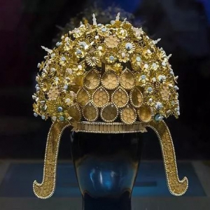 摘要:对于今天的中国人来说,凤冠已经成为了传统女性礼服的标志性象征。但实际上在相当长的时间中,模拟自然的“花树”才是中国女性礼服冠中最核心的组成部分,“凤冠”则源于常服冠。本文以新近修复成功的隋炀帝萧皇后冠饰为例,考证中古时期后妃花树冠花树、钿、博鬓组合模式的真正形态,及其形成与演变过程,并探讨花树冠与凤冠的不同概念与使用。2013年,隋炀帝杨广和萧皇后墓在扬州被发现,成为当年最重要的考古发现之一