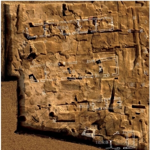 唐昭陵的营建除了在九嵕山主峰之内置地宫,还围绕陵山周围建成了规模宏大的建筑群。昭陵陵山主体建筑大致可分为:元宫(墓室)、朱雀门(南司马门)和献殿建筑群、玄武门(北司马门)和祭坛(北司马院)建筑群、寝宫(下宫)建筑群、东青龙门和西白虎门及垣墙角阙建筑群。另外缘山凿石还架设有栈道。 昭陵地宫复原图“元宫”凿于九嵕山主峰南侧山腰的峭壁上,距主峰顶部80余米。据《唐会要》载,从埏道(墓道)至元宫(墓室)深