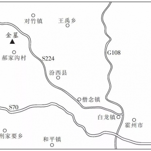 2015年8月,山西省考古研究所对在基本建设过程中发现的一座金代壁画墓(编号2015FHM1,以下简称M1)进行了抢救性发掘。此墓位于山西省汾西县永安镇郝家沟村北的山梁上,东南距汾西县城约10公里(图一)。墓葬所在山梁北高南低,南北宽、东西窄,视野较为开阔,东西两侧均为水蚀严重的陡峭山坡,属典型的黄土高原残垣沟壑区地貌。墓葬开口距现地表约0.4米,墓顶北部遭施工破坏,墓室内已被扰乱,堆土厚约0