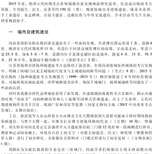 2015年度,隋唐五代时期考古各领域都有新发现和新研究成果,发表或出版的考古简报、专刊报告、论文、论著等约150篇(部)。现谨按城市及建筑遗址、陵墓及墓葬、手工业遗存、墓志碑刻、石窟寺遗存、边疆民族与中外交流遗存、学术活动等几个方面,择要概括如下。 一 城市及建筑遗址 河南省洛阳市隋东都回洛仓遗址有了一些新的发现,共清理出漕运 ...