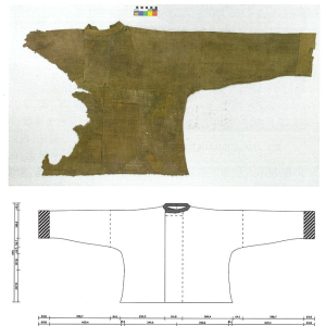 摘要:2019年,青海省文物考古研究所在青海省海西州都兰县哈日赛墓地发掘7世纪中叶至9世纪末吐蕃时期墓葬7座,出土470余件不同材质的器物。其中M7出土的服饰经整理修复后形制比较完整,包括褐色圆领短上衣、黄地条纹小口合裆裤和黑色长靿尖头靴等。分析服饰面料和制作工艺可知:圆领短上衣主体面料为平纹绢,领、袖缘边镶以织锦,用平面裁剪法裁制而成;小 ...