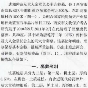 唐郭仲恭及夫人金堂长公主墓发掘简报根据出土墓志可知,墓主郭仲恭、金堂长公主分别于唐会昌四年(844) 和唐符二年(875)入葬。该墓为长斜坡墓道单室砖室墓,带3天井,墓室平面呈方形。此类墓葬使用时间较长,从初唐延续至中晚唐,但集中于初唐至盛唐时期,有杨玄略墓(864)、张叔遵墓(871)。墓主郭仲恭,字德卿,唐汾阳王郭子仪之曾孙,驸马都尉、拜骑省左 ...