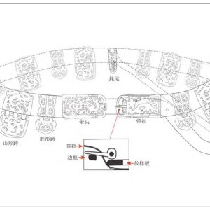 利用微距摄影的方法,可以把握郑州上街西晋墓出土鎏金铜晋式銙带的纹样、形制及金属工艺特征。通过加工痕迹分析,判断该例资料的主要部件系铸造成形,采用了合范铸造→錾刻→鎏金这一制作工序。在西晋中晚期的洛阳皇室附属作坊,晋式銙带的制作中出现了以平面呈三角形与凹陷的半球状痕迹为特征的錾刻技法。参考同类器物的出土状况,详细复原了该例资料的使 ...