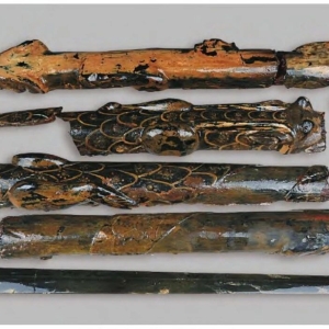 南昌西汉海昏侯刘贺墓出土木漆器3000余件,其中有漆木剑椟数件。剑椟类器物普遍残损较重,器身残断,褪色严重(图一)。经拼合后以一对漆龙形剑椟(M1:486、490)保存尚好,也最为精美,试论如下。图一 漆龙形剑椟(M1:486)一 基本情况 刘贺墓西藏椁北部的“武库”中出土有剑椟数件,位置相对集中,质地均为漆木。因武库北侧的衣笥库在历史上曾遭盗扰, ...