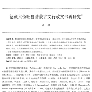 曲强︱德藏六份吐鲁番蒙古文行政文书再研究原创曲强西域研究2025年03月25日 13:42新疆来源:《西域研究》2025年第1期德藏六份吐鲁番蒙古文行政文书再研究曲 强内容提要20世纪初德国考察队在吐鲁番等地区收集了一批古文书,其中包括六件较为完整的蒙古文行政文书,属察合台汗国至东察合台汗国时期。这六份文书涉及吐鲁番地区土地和水域的分配、管理及税收, ...