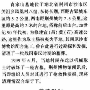湖北荆州市沙市区肖家山一号秦墓荆州市博物馆(原载《考古》2005年第9期)三、结语肖家山M1是一座残幕。由残存的墓葬形制、随葬器物组合、器形等来看,具有浓厚的楚文化因素,同时又掺入了典型的秦文化特征,据此可推知该幕的大致年代。该墓为长方形土坑竖穴墓,近坑底处设生土二层台,椁室平面呈长方形,椁周围填青膏泥,具有楚墓特点。这些特点以后又在 ...