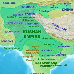 Kushan territories (full line) and maximum extent of Kushan dominions under Kanishka (dotted line), according to the Rabatak inscription.Introduction The Kushan Empire (c. First–Third Centuries) reac