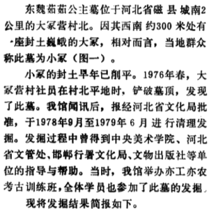 磁县文化馆小冢的封土早年已削平。1976年春,大冢营村社员在村北平地时,铲破墓顶,发现了此墓。我馆闻讯后,报经河北省文化局批准,于1978年9月至1979年6月进行清理发掘。发掘过程中曾得到中央美术学院、河北省文管处,邯郸行署文化局、文物出版社等单位的指导与帮助。当时,我馆举办亦工亦农考古训练班,全体学员也参加了此墓的发掘。(12)墓志 一盒。 ...