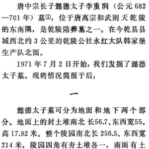 陕西省博物馆、乾县文教局唐墓发掘组原载《文物》1972年第7期懿德太子李重润卒年仅19岁,生前过着骄奢淫逸的寄生生活,墓中的每一幅壁画都是李重润宫廷生活的真实写照。死后,唐中宗将其由洛阳迁来陪葬乾陵,修筑规模巨大的陵墓。陵墓地面封土堆实测结果,原长58、宽58、高17.92米,计合夯土29,418方,约需一百个农民一年的劳动。另外,墓道、天井、过洞、 ...