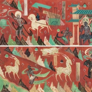 莫高窟 第257窟 九色鹿本生 主室 西壁,北魏(公元368年-534年),高96厘米,长385厘米九色鹿故事,也叫鹿王本生,有两个译本,一为月支人支谦译的《佛说九色鹿经》;一为三国时康居僧康僧会译的《六度集经》中的《修凡鹿王本生》,基本内容是一致的。故事情节大体如下:从前恒水边有一只九色鹿,一天听到有人在水中呼救,九色鹿赶快来到河边。见一人正在 ...
