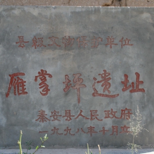 雁掌坪遗址保护标志 雁掌坪遗址西大部分 雁掌坪遗址南大部分 雁掌坪遗址断崖处可见陶片 雁掌坪遗址灰坑. 雁掌坪遗址断崖处的红烧土 雁掌坪遗址采集的器物(双耳细颈彩陶瓶) 雁掌坪遗址位于天水市秦安县五营乡焦沟村西,清水河南岸台地上,南北长约500米,东西宽约200米,面积10万平方米,属仰韶文化遗存。地表及断崖上暴露有泥 ...