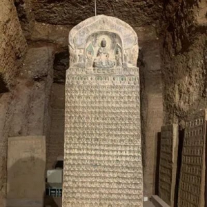 麦积山石窟第133窟1号碑——千佛碑 位于前堂西侧之北。高1.85米,上宽0.53米,下宽0.60米,厚0.16米。用整块大理岩雕成,保存完好,色彩犹存。碑身前、后、左、右四面皆雕千佛,横平竖直,排列有序,布局严谨,每身千佛均是精雕细琢。千佛均着色敷彩,旁有墨书榜题(现已不清)。全碑共有大小雕像1312身,是名副其实的千佛碑。碑首前后两面均雕刻佛 ...