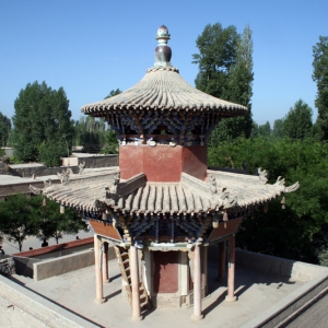 喀孜哈纳清真寺 : 位于吐鲁番市新城路西段南侧的居民区内。坐南朝北,占地面积2750平方米,建筑面积1 830平方米。塔楼两面各有巍然高耸的三柱护立,呼唤楼顶饰有“新月”。塔楼前为四方形广场和中央花坛,与塔楼相对。东侧为花园,南侧为净室,西侧礼拜殿可容纳1 000人礼拜。该寺始建于清乾隆年间,即吐鲁番回部王额敏和卓时期。“喀孜哈纳”,维吾尔语,意为“宗教 ...