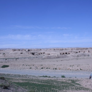 克孜勒协海尔故城 : 位于新和县城南22公里,在渭干乡克孜勒协海尔村境。故城地处海拔995米,分南北两城。南城为主城,南北长180米,东西宽145米,总面积26 100平方米,高5米。北城东西长130米,南北宽80米,总面积10 400平方米。城外有一烽火台,两城间距90米。因该城城体均由红土筑成,故名“克孜勒协海尔”,维吾尔语,意为“红城”。系新和县文物保护单位,属汉唐遗 ...