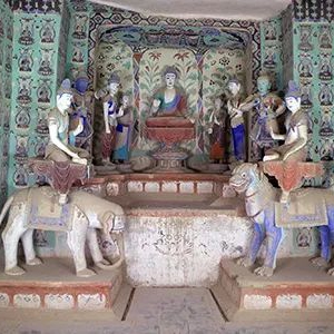 甲朗聚龙佛寺 : 位于哈密市五堡乡四堡村北300米,东经90°54′26″,北纬42°56′37″,海拔664米。佛寺坐落在白杨河西岸的黄土丘地上,一条便道将其分成东西两部分。构筑形式由下部的土墩基座和上部土坯建筑组成。 路东部分保存较好,基座为长方形,南北长17.3米,东西宽12米,高3米。上部有前后两室的佛寺,以甬道相连,四周设回廊。两室均以草泥抹墙,内壁绘有壁画 ...