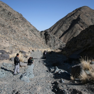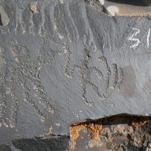 夹皮泉岩画 : 位于木垒哈萨克自治县照壁山乡学房村南约600米的夹皮泉沟,散布在东山坡的褐黑色岩石上,有10余组。第一组画面是羊,羊角作了夸张。第二组是三只奔跑的羊。第三组由一猎人、两只猎犬和一只鹿构成狩猎图。第四组有三个人,其中一人生殖器突出,三人上方有两只羊、两只鹿、一只狐狸。第五组是一人作舞蹈状,双腿叉开半蹲,性器明显。