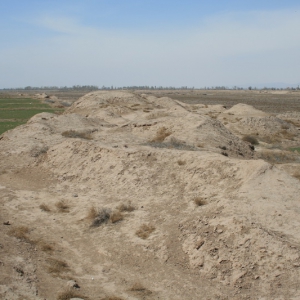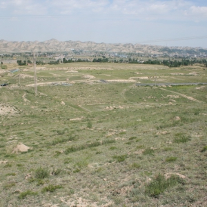 大庙城城址 大庙城城址 大庙城城址采集标本 位于金昌市金川区双湾乡岳家沟村东南侧。座北向南,平面呈长方形,南北长180米,东西宽170米。面积30600平方米。城墙残高4米。城内中部筑墙,将城分隔成两部。城外有瓮城。城门向南。城内采集有铁串饰、石杵、陶片等。保存较好,对研究河西城建史有重要价值。