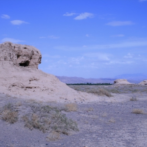 沙城城址 沙城城址 沙城城址采集标本 位于永昌县水源乡北地村北1公里。城平面略呈正方形,南北长300米,东西宽288米。面积约9万平方米。墙体黄土夯筑,基宽约6米,顶宽4米,残高3--5米,夯层厚0.12--0.14米。南墙开一门。城四角各有角墩,今已无存。每边城墙各有2个马面。墙垣夯层内采集有夹砂灰、红陶残片。城西南为一处魏晋时期的墓群,面 ...