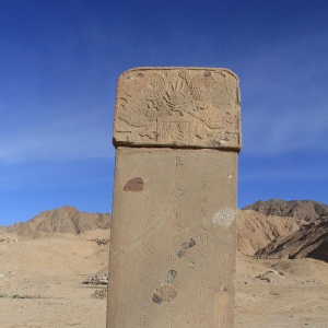辉腾阿夏墓地石人 : 位于福海县喀喇额尔齐斯河的上游。在一座方形石棺墓东部立石人一尊,面向东。刻石为自然石块,高约0.6米。刻石上部隐约勾勒人的脸部,浮雕出眼睛、鼻子和嘴,比较模糊。