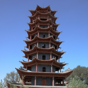万寿寺木塔 万寿寺木塔翼角 万寿寺藏经楼 位于张掖市甘州区县府街路西。又名木塔寺。创建于北周,隋开皇二年(582)重建,后经唐贞观十三年(639)、明永乐元年(1403)、清康熙二十六年(1687)数次重修,清末毁于大风。坐西向东,现仅存建于中轴线上的木塔和藏经楼。现存木塔重修于民国十五年(1926),属八角九层楼阁式,高32.8米。底层每边宽15.1米 ...