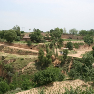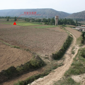 东庄墓群全貌 东庄墓群出土并伯甗 位于灵台县新集乡崖湾村。面积约1.5万平方米,暴露有竖穴土坑墓数座。1982、1983年先后清理墓葬2座,均为长方形竖穴土坑墓,出土“并伯作宝彝”铜甗等40余件。地表散见绳纹红陶片和灰陶残片。