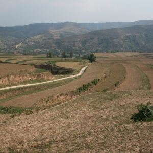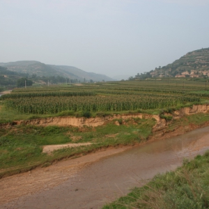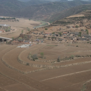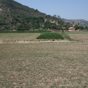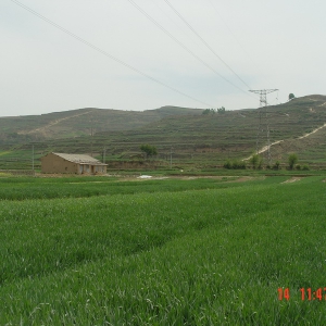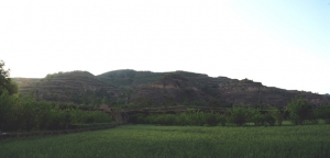 瓦岗川遗址全景 瓦岗川遗址中心点 瓦岗川遗址采集标本 位于合水县板桥乡柳沟行政村柳沟自然村309国道南侧瓦岗川口台地一带。新石器时代至青铜时代。面积约10万平方米,文化层厚1--1.5米。采集有黑彩叶纹彩陶罐、盆,鱼纹彩陶钵、泥质红陶杯口尖底瓶及夹砂红陶绳纹罐等器物残片。