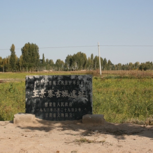 泉子东墓群全景 泉子西墓群局部 泉子东遗址标志碑 位于玉门市玉门镇泉子村西北300米。是一处魏晋墓群。面积不详。地表可见7座圆形封土堆,其中最大者高1.5、底径3米,周围散见灰陶片及碎砖块。墓葬保存较好,对我省魏晋考古有重要价值。