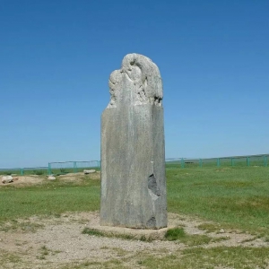 《阙特勤碑》(图16)竖立在一块不大的方形碑座上,碑座长159厘米,宽112厘米,高度不详,凸出地面十几厘米。石碑青石质,高327厘米,宽132厘米,左侧厚46厘米,右侧厚45厘米。碑的边角切削过,形成倒角,倒角处也刻满鲁尼文。图16 竖立在原野上的阙特勤碑碑的正面朝东,碑额与碑身一体雕凿而成,碑额为两螭龙相对,不过左侧缺一角,为雷击所致。阙特勤碑 ...