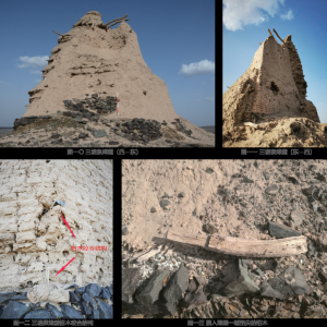 北石河 1 号烽火台位于花海镇中渠村东北。平面呈矩形,剖面呈梯形。顶东壁宽2米,南壁宽1.5米,西壁宽 3.6米,北壁宽 1.5 米,底边长 10 米,高6.5 米。内部土坯砌筑,土坯规格 40×20×15 厘米;外部红柳夹砂土叠筑,叠筑层顶部厚 1.5 米,底部厚 2 米,红柳层厚0.8~0.12米,砂土层厚 0.1~0.14米。烽火台周围散存灰陶片。