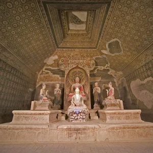 莫高窟第94窟 晚唐第94窟位于北大像即今第96窟之北,中间只隔一个较小的第95窟(元代)。洞窟修建于晚唐,窟形为覆斗顶殿堂式洞窟,窟中央设中心佛坛,后有背屏直通窟顶。表层壁画为宋重绘,底层露出晚唐壁画,塑像为清代重修。中心佛坛上宋塑趺坐佛一身,清时重修,其余五尊皆为清塑。背屏上宋画华盖,二飞天及佛光等,窟顶宋浮塑团龙图案,四披为团 ...