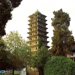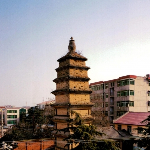 法源寺塔,位于陕西省富平县东北33公里处的美原镇西寺小学内(法源寺旧址),塔的东、西、北为居民。据《富平县志》樊志卷二载:“法源寺在美原镇,创建未祥,内有塔数级”。寺貌既不复见,当年规模无从考证,据传塔为唐高宗咸亨二年(671)建美原县后所建,高近20米, 外周周长29米,壁厚1.75米。楼阁式七级八角中空花塔,青砖仿木结构,塔顶造形别致,有 ...