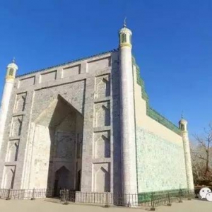 艾提尕尔清真寺 : 位于喀什市中心的艾提尕尔广场西面,至今已有500多年的历史,是一座规模宏大的伊斯兰教寺院建筑。占地约1.68万平方米,由寺门塔楼、庭园、经堂和礼拜殿四大部分组成,为自治区重点文物保护单位。寺门塔楼正对艾提尕尔广场,天蓝色寺门宽4.3米,高4.7米,门两侧各有短墙相接;外两侧各有一高12.5米的砖砌圆柱,底粗顶细,柱顶各有一塔楼,楼上竖立一 ...