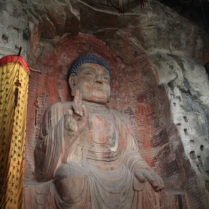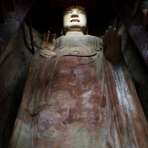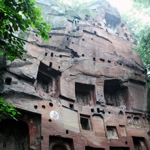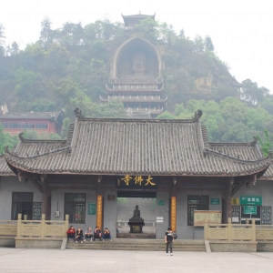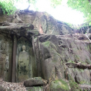 大像山摩崖造像位于四川省阆中市,据现存碑记记载,大佛凿于唐代开元至元和年间(公元713—820年),通高9.88米,为弥勒佛坐像,刀法简洁流畅,衣褶为阳纹。佛身后尚有10厘米高的小佛三千余尊,镌工精湛。龛侧有力士像两尊,东侧观音像两龛,大像龛两侧有历代妆大像石刻碑记和诗文题刻十余处,其中宋代颜体楷书石刻“虎溪”字径达5米。像东侧二十米石室墓仿木结构建筑石刻一处。再东十米有宋石窟一间,内存唐元和四年碑记。