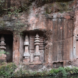 蒲江石窟位于四川省蒲江县西南10公里处的朝阳湖山崖上和鹤山镇蒲砚村。该石窟包括唐代68龛、五代1龛、宋代7龛、明代1龛、清代10龛。飞仙阁摩崖造像位于蒲江县西南朝阳湖镇二郎潭两岸山崖上,共92龛,造像777尊。其中北岸87龛,南岸5龛。最早造像为唐永昌元年(公元689年),唐代造像64龛491尊,主要有唐永昌元年(689年)所造瑞像龛、释迦、三世佛、华严三圣、弥勒、观音、千手观音、如意轮观音、地藏、天龙八部、胡人天王